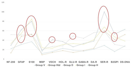 Profile of autoimmune reactivity to the neural and non-organ-specific visceral autoantigens in clinically significant chronic fatigue of various etiology, in comparison with control group. The absolute level of autoimmune reactivity in units of optical density is shown by the Y-axis. Statistically significant intergroup differences are outlined with ellipses or circles.