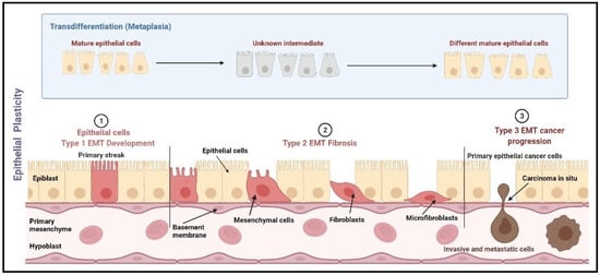 EMT categorization based on epithelial plasticity. EMT is categorized into three types, namely mesenchymal, fibroblast, and metastatic. Type 1 EMT occurs during the mesenchymal transformation of primary epithelia, which occurs during gastrulation, neural crest cell initiation from neuroepithelial cells, and production of endocardial cells (cushion tissues) from cardiac endothelial cells. Type 2 EMT includes the transition of secondary epithelial cells into the fibroblast tissues, as observed in the wound healing process, tissue regeneration, and fibrosis in adult tissues. Type 3 EMT occurs mostly in carcinoma cells which transit from epithelial cells to mesenchymal cells leading to the formation of metastatic tumor tissue []. Image created using Biorender (https://biorender.com/, accessed date 15 January 2022).