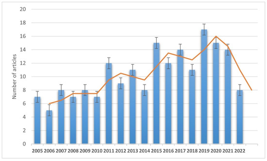 Annual trend of selected and discussed publications (from 1 January 2005 to 30 March 2022).
