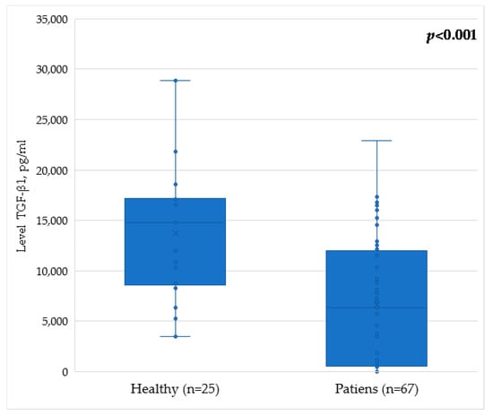 TGF-β1 serum levels in healthy donors constituted 17,374 [8802; 17,152] pg/mL. In the group of patients following breast cancer treatment, the serum levels of TGF-β1 were 6356 [551; 11,706] pg/mL. In an intergroup comparison, patients after breast cancer treatment showed a statistically significant decrease in the level of TGF-β1 molecules (Table 4). For clarity, the results are also demonstrated in Figure 2.