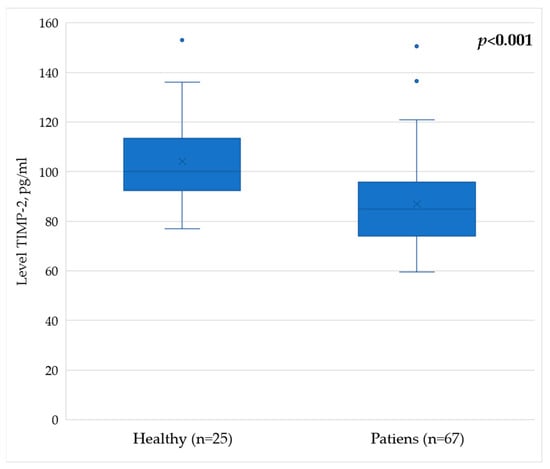 TIMP-2 serum levels in healthy donors constituted 100 [92; 113] pg/mL. In the group of patients following breast cancer treatment, the serum levels of TIMP-2 were 85 [74; 95] pg/mL. In an intergroup comparison, patients after breast cancer treatment showed a statistically significant decrease in the level of TIMP-2 molecules (Table 4). For clarity, the results are also demonstrated in Figure 4.