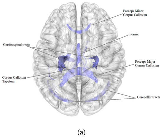 Three-dimensional reconstruction of the white matter tracts with the signs of a decrease in quantitative anisotropy in patients after BC treatment in comparison with the control group ((a) axial plane, (b) coronal plane).