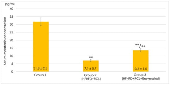 Under the combined effect of RCL and HFHLD, the serum melatonin concentration significantly decreased by 4.5 times, achieving 7.1 ± 0.7 pg/mL (p < 0.001) (Figure 1). The dietary supplementation with resveratrol under RCL and HFHLD resulted in the growth of the melatonin level, which was 1.9 times higher than the respective values in group 2 (p < 0.001).
