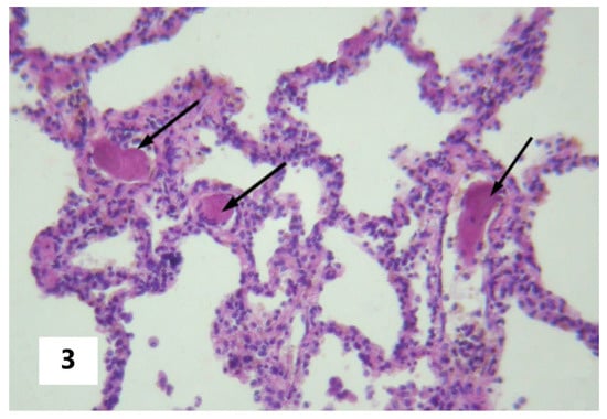 Fibrin clottings of blood in the vessels of the maternal pulmonary microcirculation. The arrows indicate fibrin clottings in pulmonary vessels (Hematoxylin and Eosin stain, ×100 magnification).