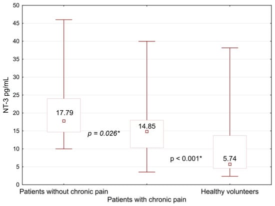 Comparison of neurotrophin-3 levels between women with PMPS, its absence, and a group of healthy volunteers. *—differences between the groups were significant at p < 0.05.