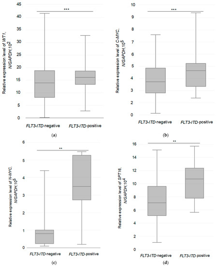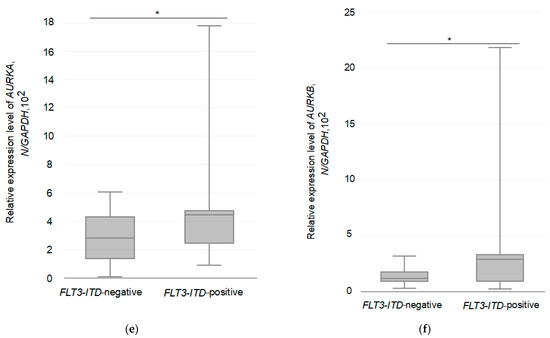 As for the average expression levels of the SPT16, AURKA, and AURKB genes in the two different groups, they were highest in the FLT3-ITD-positive (1.0 × 105/GAPDH, 4.2 × 102/GAPDH and 3.1 × 102/GAPDH) group (Table 3). In the FLT3-ITD-negative group, the mean expression levels of the SPT16, AURKA, and AURKB genes were lower and did not exceed the following values: 7.7 × 104/GAPDH, 2.8 × 102/GAPDH, 1.3 × 102/GAPDH. The range of changes in the expression of the studied genes in both groups is shown in Figure 1d–f. Increased expression of SPT16 was detected in FLT3-ITD-positive (n = 9) and FLT3-ITD-negative (AML1-ETO, n = 5; CBFβ-MYH11/A, n = 4; normal karyotype, n = 2) patients. AURKA/B overexpression was detected in 1 patient carrying the FLT3-ITD mutation. Thus, despite a slight (WT1, C-MYC, AURKA, AURKB) or pronounced (SPT16, N-MYC) increase in the average expression level of the above mentioned genes in the FLT3-ITD-positive group compared to the FLT3-ITD-negative group, the difference between them was statistically significant only for four genes: WT1, C-MYC, N-MYC, and SPT16 (Table 3).