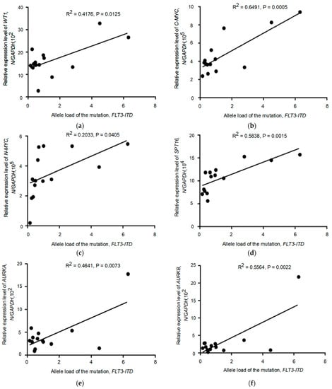 Correlation analysis was performed to determine the relationship between the relative expression level of the studied genes (WT1, C-MYC, N-MYC, SPT16, AURKA, AURKB) and the allelic load value of the FLT3-ITD mutation in the FLT3-ITD-positive group (Table S3). The results are shown in Figure 2a–f.