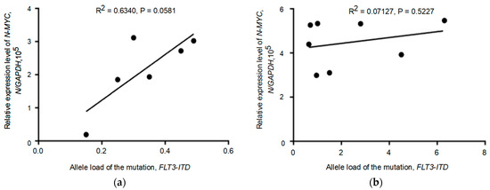 The expression levels of five genes (WT1, C-MYC, SPT16, AURKA, AURKB) were shown to correlate with increased FLT3-ITD allelic load (p = 0.0125, p = 0.0005, p = 0.0015, p = 0.0073, p = 0.0022). As for the N-MYC oncogene, correlation analysis showed a weak or absent association between N-MYC gene expression and FLT3-ITD allelic load in patients carrying the FLT3-ITD mutation (p = 0.0405). We then analyzed patients in two subgroups with FLT3-ITD allelic load thresholds above and below 0.5 (>0.5 vs. <0.5). In this case, we found no significant correlation between N-MYC expression and FLT3-ITD allelic load in both patient subgroups, as shown in Figure 3a,b.
