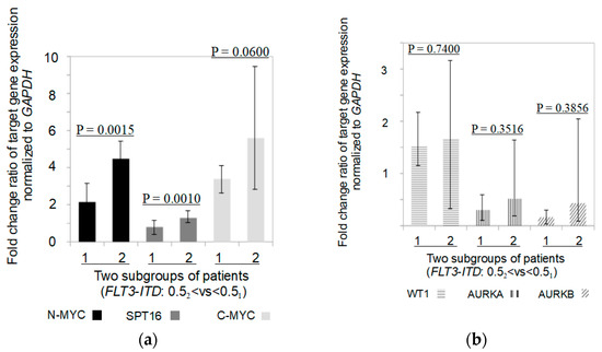 We also determined the fold change of gene expression in patients carrying the FLT3-ITD mutation depending on allelic load. As a result, we found 1.1, 1.5, 1.6, 1.7, 2.0, and 2.6-fold increases in gene expression levels of WT1, SPT16, AURKA, C-MYC, N-MYC, and AURKB in FLT3-ITD mutation carriers with higher (>0.5) allelic load compared with FLT3-ITD carriers with lower (<0.5) allelic load, as shown in Figure 4a,b.