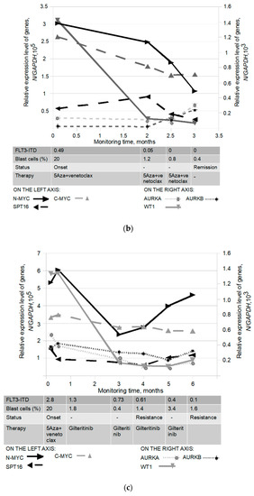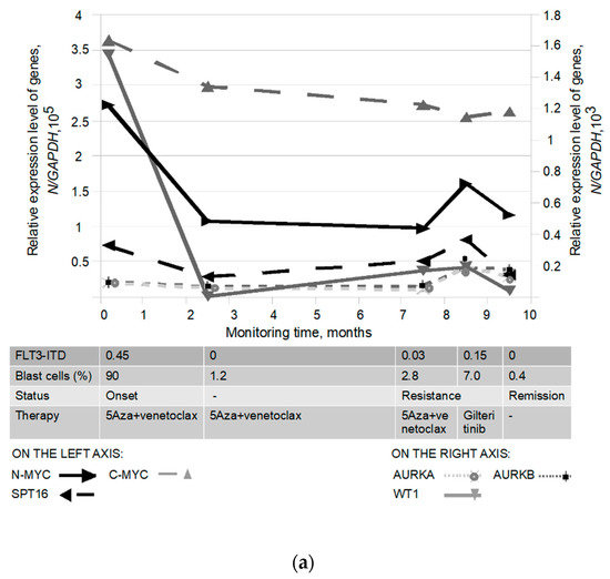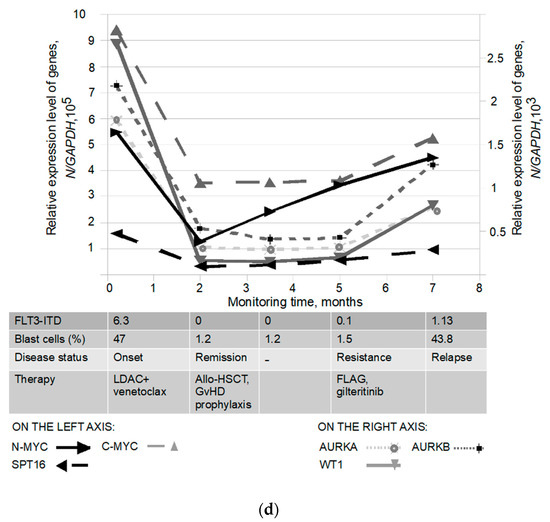 According to Figure 5a,b, two patients (A and B) had a low (0.45 and 0.49) FLT3-ITD allelic load in the onset of AML and simultaneously overexpressed N-MYC (2.7 and 3.0 × 105/GAPDH) and WT1 (1.5 and 1.4 × 103/GAPDH) oncogenes. After therapy, both patients achieved CHR and full molecular response. All investigated biomarkers of both patients returned to normal, including a decrease in N-MYC (WT1) oncogene expression. However, one of these patients (A), as mentioned above, was infected with SARS-CoV-2 one month after achieving remission, resulting in pulmonary failure and death. As shown in Figure 5c,d, the other two patients (C and D) initially had a high (2.8 and 6.3) FLT3-ITD allelic load and N-MYC overexpression (5.3 and 5.4 × 105/GAPDH). Moreover, both patients had increased expression of the WT1 (1.3 and 2.6 × 103/GAPDH) and SPT16 (1.52 and 1.57 × 105/GAPDH) genes. However, only one of these patients had elevated AURKA and AURKB gene expression (1.7 and 2.1 × 103/GAPDH). The first patient (C) received the tyrosine kinase inhibitor gilteritinib (120 mg/day; hematopoietic stem cell transplantation was not recommended because of cardiac parameters) after induction therapy. The patient achieved hematological remission with partial recovery of peripheral blood (platelet counts) and simultaneous reduction of FLT3-ITD allelic load (0.1). During 3 months of therapy, the expression of WT1, C-MYC, AURKA, AURKB decreased and did not exceed normal levels, whereas the expression of N-MYC (SPT16) increased. Four months later, the patient relapsed and died. The second patient (D) received myeloablative conditioning, allogeneic hematopoietic stem cell transplantation (allo-HSCT), and chemotherapy. During 3 months after transplantation, the FLT3-ITD allelic load was undetectable or reduced. At the same time, the expression of WT1, C-MYC, AURKA, AURKB, and SPT16 did not exceed normal values. On the contrary, N-MYC expression gradually increased. Five months after transplantation, the patient relapsed (blasts: 43.8%; FLT3-ITD: 1.13), resulting in a fatal outcome. Of note, N-MYC expression was significantly elevated in both patients after therapy, despite decreased FLT3-ITD allelic load. At the same time, the development of treatment resistance was observed in both patients.