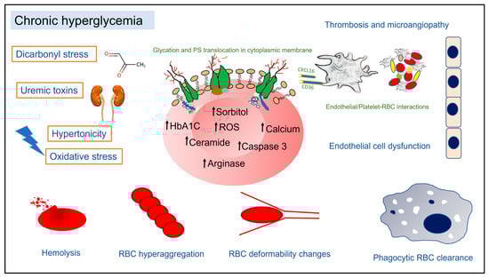 Accordingly, similar changes in the RBC phenotype of DM patients can be surmised in concomitant conditions such as hypertension and patients with dyslipidemia [109,125,126]. Chronic renal failure can aggravate RBC cell death in DM, as uremia and proteinuria have been shown to reduce RBC survival in multiple studies [64,127,128,129,130,131,132]. Dialysis treatment may further impact RBC survival within DM patients [130,133,134]. In a previous study, chronic kidney disease was shown to enhance oxidative imbalance and PS exposure in RBCs drawn from T2D patients [135]. Strikingly, morphological alterations in RBCs in DM patients may influence the quality of donated blood for transfusion. A recent study showed that donated RBCs from individuals with high HbA1c levels showed increased hemolysis rate, K+ efflux, oxidative stress, and PS exposure, characteristic features of the RBC storage lesion [136].
