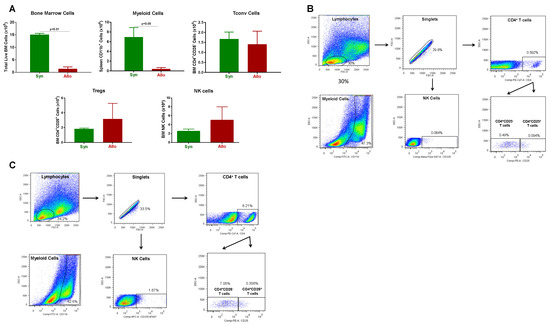 Bone marrow analysis in syngeneic and allogeneic mice. (A) Total bone marrow (BM) cell numbers and BM-residing immune cells were quantified at 4 weeks post T cell transfer for syngeneic mice and prior to euthanasia for allogeneic mice described in Figure 1. Myeloid cells (CD11b+), Conventional T cells (Tconv cells; CD4+CD25−), regulatory T cells (Tregs; CD4+CD25+), and NK (CD335+) cells were quantified by flow cytometry as described in Methods Section 2.4. The number of mice in the syngeneic and allogeneic groups are N = 3 and N = 6 each, respectively. Data represent the mean ± SEM. (B,C) Representative flow cytometry plots of syngeneic and allogeneic mice, respectively.