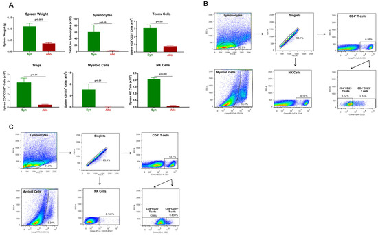 Spleen weight and immune cell analysis in syngeneic and allogeneic mice. (A) Spleen weights, splenocyte numbers and spleen-residing immune cells were quantified at 4 weeks post T cell transfer for syngeneic mice and prior to euthanasia for allogeneic mice. Conventional T cells (Tconv cells; CD4+CD25−), regulatory T cells (Tregs; CD4+CD25+), Myeloid cells (CD11b+), and NK (CD335+) cells were quantified by flow cytometry using as described in the Methods Section 2.4. The number of mice in the syngeneic and allogeneic groups are N = 3 and N = 4, respectively. Data represent the mean ± SEM. (B,C) Representative flow cytometry plots of syngeneic and allogeneic mice, respectively.