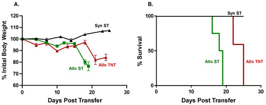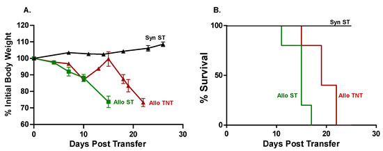Effects of housing temperature on body weight and survival following transfer of small numbers of allogeneic T cells. Flow-sorted, allogeneic CD4+CD25− T cells from CD45.1 Bl6 donors (2k T cells/gbw) were injected (i.v.) into sub-lethally irradiated BM12 recipients and housed at ST (AlloST) or TNT (AlloTNT). Sub-lethally irradiated BM12 mice injected (i.v.) with 2k/gbw CD4+CD25− T cells from BM12 donors (2k/gbw) and housed at ST served as the syngeneic control group (SynST). (A) Body weights of mice in the three groups at different times following injection of T cells. p < 0.027 for SynST vs. AlloST at day 18. (B) Kaplan–Meir survival plots of the three groups. Mice exhibiting severe disease as evidenced by lethargy, kyphosis and/or weight loss ≥ 20% of their original weight were designated as moribund and euthanized. p < 0.01 for SynST vs. AlloTNT; p < 0.01 for SynST vs. AlloST and p < 0.01 for AlloST vs. AlloTNT. The starting number of mice in the SynST, AlloST and AlloTNT groups were N = 4, N = 4 and N = 5, respectively.