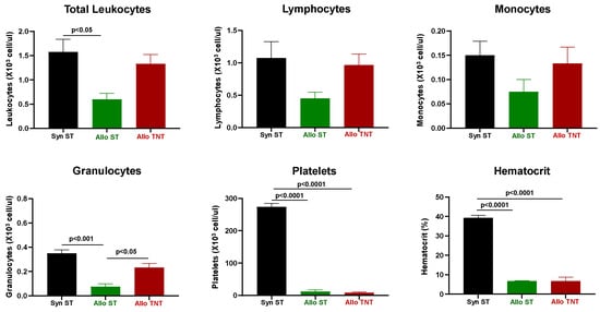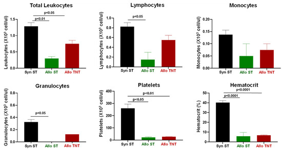 CBC analysis revealed significant reductions in the total number of circulating leukocytes, platelets and hematocrit in both the AlloST and AlloTNT mice when compared to their SynST controls (Figure 11). In addition, we found that the number of circulating lymphocytes and granulocytes were selectively reduced in the AlloST but not AlloTNT group when compared to the SynST group (Figure 11).
