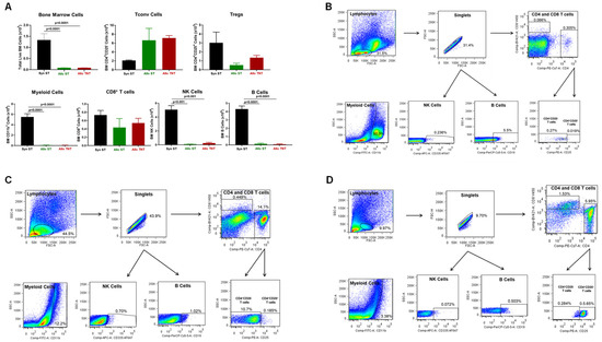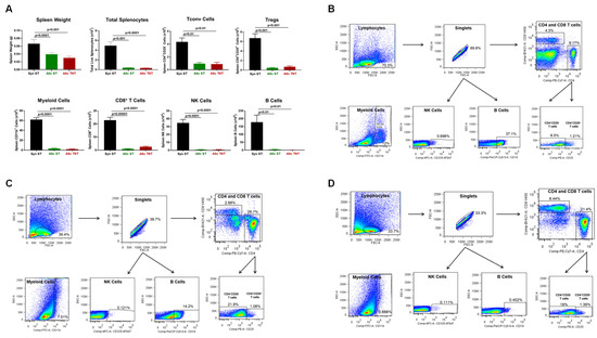 Following euthanasia, the numbers and phenotypes of the T, B, myeloid, and NK cells in the spleen and bone marrow were quantified using flow cytometry as we previously described []. Briefly, single-cell suspensions from spleens and femoral BM were suspended in Tris-buffer with ammonium chloride (ACT) to lyse red blood cells and then resuspended in FACs buffer (PBS containing 4% fetal calf serum). A hemocytometer was used to quantify the total number of live (i.e., trypan blue-excluding) BM and spleen cells. Cells were stained with CD4 PE-Cy7 (GK1.5), CD8 V450 (53–6.7), CD25 PE (PC61), CD19 PerCP-Cy5.5 (1D3), CD335 Alexa Fluor647 (NK p46)(29A1.4) and CD11b FITC (m170) and analyzed by flow cytometry [].