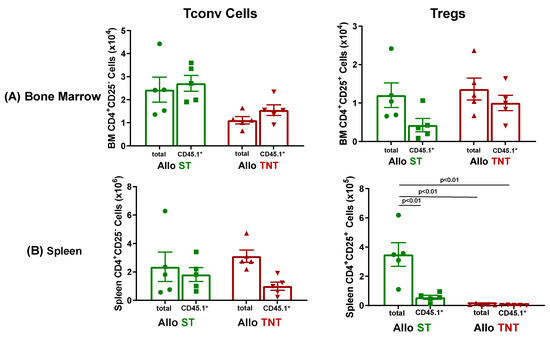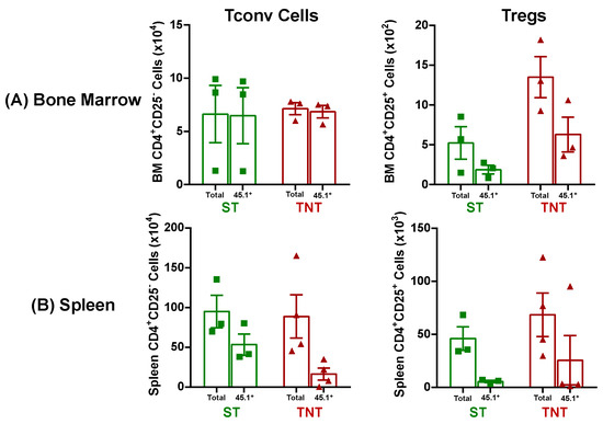Another interesting and particularly novel finding made in the current study was the inability of allogeneic T cells to induce BM and spleen damage in RIC-treated outbred mice housed at ST or TNT (Figure 15, Figure 16 and Figure 17 and Figures S7–S9). As pointed out previously, all mouse models of aGVHD use inbred donors and recipients. These genetically-constrained mice are generated by brother/sister mating for at least 20 generations producing genetically-identical animals. While current mouse models of aGVHD have been critical to our understanding of many of the immunopathological mechanisms involved in this disease, they most likely do not encapsulate the hybrid vigor and genetic diversity present in humans. To our knowledge, data reported in the current study are the first to evaluate the susceptibility of outbred mice in developing aGVHD. Our data demonstrate that MHC II disparity alone does not drive T cell-mediated tissue damage, suggesting that uncharacterized immune mechanisms may contribute to disease resistance. Differences in susceptibility and/or resistance to autoimmune diseases have been well-described in mouse models of autoimmune encephalomyelitis and diabetes [,]. We hypothesized that resistance of RIC-treated CD1 mice to T cell-mediated tissue damage may be due to the presence of large numbers of Tregs relative to the numbers of allogeneic Tconv cells in BM and/or spleen. We did observe that the total numbers of Tregs approximated those of allogeneic Tconv cells in BM of mice housed at ST and TNT (Tconv cells:total Tregs were 2:1 and 1:1, respectively) (Figure 18), suggesting that expansion and/or activation of Tregs may play an important role in protecting the BM. However, using this same analysis for the spleen, we found that the ratios of allogeneic Tconv cells:total Tregs in the spleens were 5:1 and >200:1 in mice housed at ST or TNT, respectively, suggesting that Tregs are unlikely to play a role in protecting the spleen (Figure 18).