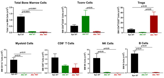 Similar to our previous findings, we observed dramatic reductions in BM cellularity in both the AlloST and AlloTNT groups when compared to their SynST controls that correlated with large and significant decreases in myeloid cells, NK cells and B cells (Figure 12). Interestingly, we found significant increases in Tregs in the AlloTNT mice when compared to their AlloST counterparts or SynST controls, whereas Tconv cell numbers were markedly and significantly reduced in AlloTNT mice when compared to their AlloST counterparts (Figure 12).