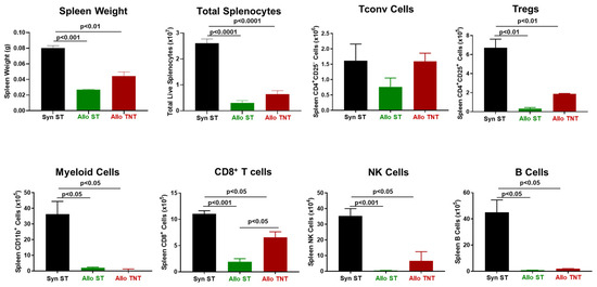 In addition, we noted significant reductions in spleen weights and marked reductions in splenocyte number, Tregs, myeloid cells, CD8+ T cells, NK cells and B cells in both the AlloST and AlloTNT groups when compared to their SynST controls (Figure 13). We also observed a significant increase in CD8+ T cell numbers in AlloTNT mice vs. the AlloST group (Figure 13).