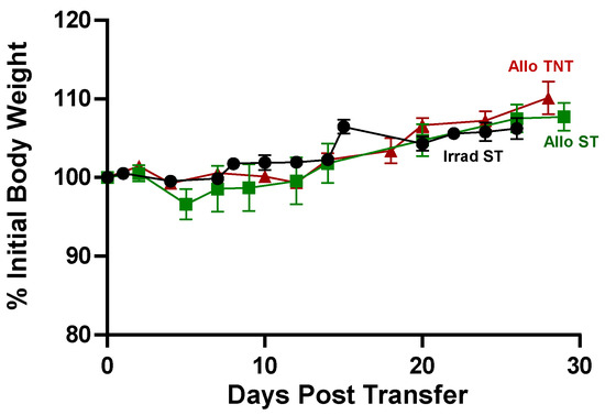 For example, the large majority of mouse models of aGVHD use lethal, total body irradiation (TBI) to produce myeloablation prior to BM and T cell transfer [,]. Lethal TBI induces indiscriminate damage to several different tissues and organ systems that respond with the upregulation of numerous inflammatory cytokines, chemokines and chemokine receptors that promote the recruitment and activation of alloreactive T cells to the gut, liver, skin, lung, thymus, BM, and/or spleen [,,,,,,,,,,,,]. This protocol contrasts with more current, pretransplant conditioning protocols for patients who receive nonmyeloablative, reduced intensity conditioning to decrease tissue injury and the consequent development of aGVHD [,,]. Another important extrinsic factor that is receiving increased attention in preclinical studies is animal care housing temperature. All animal care facilities in the U.S. house mice at a standard temperature (ST) of 22–24 °C, which is below murine thermoneutral temperature (TNT) of 30–32 °C [,,,]. Vivaria ST housing is known to create mild cold stress that may alter murine immune responses to different allo- or autoantigens when compared with mice housed at TNT [,,,].