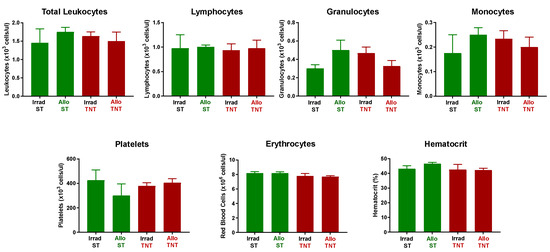 CBC analysis was quantified from EDTA-treated whole blood from each mouse using the CBC software associated with the Heska HemaTrue Veterinary Hematology Analyzer at 4 weeks post T cell transfer for all mice in the following grops: IrradST, IrradTNT, AlloST and AlloTNT. The number of mice in the IrradST, IrradTNT, AlloST and AlloTNT groups are N = 4, N = 3, N = 4 and N = 4, respectively, for each group. Data represent the mean ± SEM.
