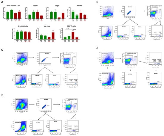 Bone marrow analysis in CD1 mice engrafted with allogeneic T cells housed at different temperatures. (A)Total BM cells and BM-residing immune cells were quantified at 4 weeks post T cell transfer for each mouse in the 4 groups described in Figure 15. Conventional T cells (Tconv cells; CD4+CD25−), regulatory T cells (Tregs; CD4+CD25+), Myeloid cells (CD11b+), CD8+ T cells, NK cells (CD335+) cells and B cells (CD19+) were quantified by flow cytometry as described in the Methods Section 2.4. (B–E) Representative flow cytometry plots of Irrad ST, Allo ST Irrad TNT mice and Allo TNT, respectively. The number of mice in the 4 groups are designated in Figure 15. Data represent the mean ± SEM.