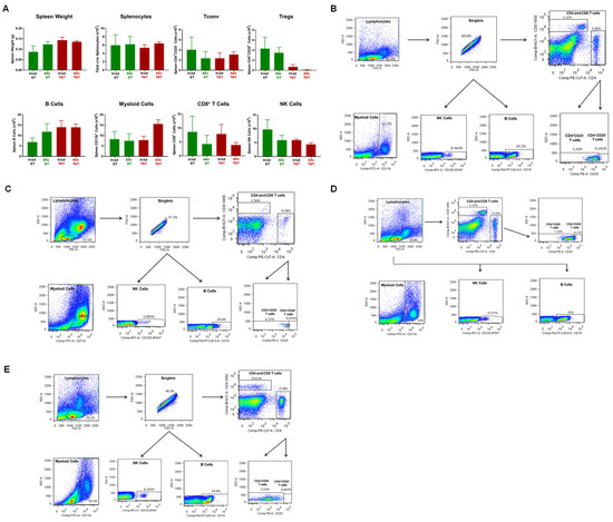 Spleen weight and immune cell analysis in CD1 mice engrafted with allogeneic T cells housed at different temperatures. (A) Spleen weights, splenocyte numbers and spleen-residing immune cells were quantified at 4 weeks post T cell transfer for each mouse in the 4 groups described in Figure 17. Conventional T cells (Tconv cells; CD4+CD25−), regulatory T cells (Tregs; CD4+CD25+), Myeloid cells (CD11b+), CD8+ T cells, NK cells (CD335+) cells and B cells (CD19+) were quantified by flow cytometry as described in the Methods Section 2.4. (B–E) Representative flow cytometry plots of Irrad ST, Allo ST Irrad TNT mice and Allo TNT, respectively. The number of mice in the four groups is designated in Figure 15. Data represent the mean ± SEM.