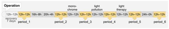 Periods of continuous telemetry data analysis (light–darkness hours in one day). Postoperative recovery period lasted 7 days, after which telemetry data was collected by periods. Each period lasted 3 days, in which the same light regime was observed; for example, 16 h of light–8 h of darkness during the day (“16 h–8 h” block in the diagram). The light regimes of all periods changed continuously. Telemetry data were assessed on the middle day of each period. A total of six periods were analyzed.