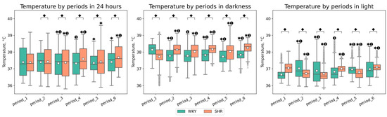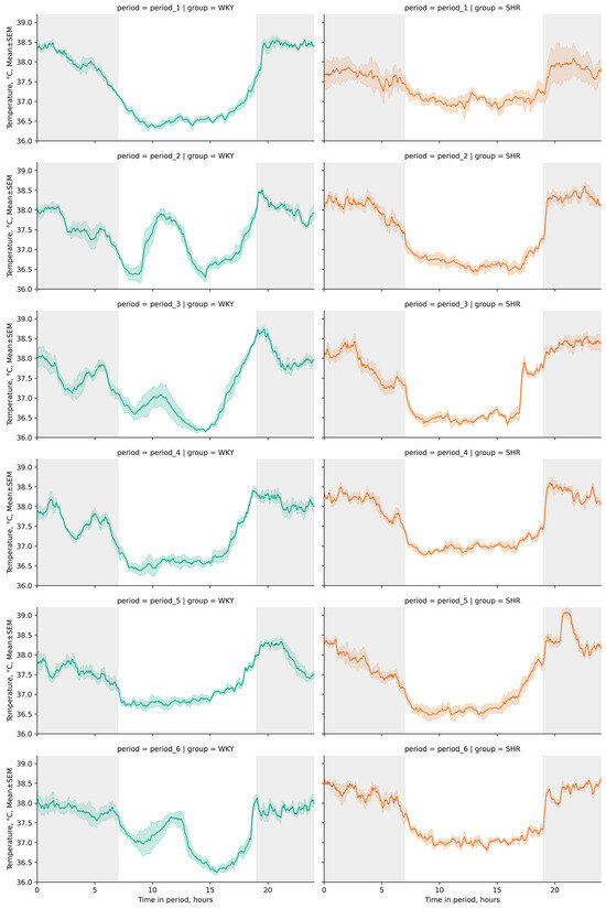 Line plots of Tcore fluctuations across 24 h cycles by periods (period_1–6) and groups (WKY and SHR). Throughout the telemetry data analysis, a standard artificial light–dark cycle was maintained in each period, with dark phases spanning from 19:00 h to 07:00 h (12 h) represented by a gray background and light phases from 07:00 h to 19:00 h (12 h) denoted by a white background. The evaluation periods under standard lighting conditions were subsequent to days exposed to various experimental lighting conditions: period_1 followed a postoperative recovery week, period_2 followed days following a 20 h light and 4 h darkness regime, period_3 followed a monochromatic light regimen, period_4 followed days affected by light pollution, period_5 followed a regimen of bright light therapy, and period_6 followed continuous illumination (24:0 h). Notably, lower levels of Tcore were recorded during daylight hours in both groups. In WKY, discernible peaks in Tcore were observed during the light phases of the second, third, and sixth periods, indicating a sharp increase in Tcore.
