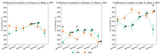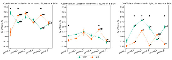 Activity coefficient of variation in 24 h, dark, and light phase of the day by periods and groups of rats. The evaluation periods under standard lighting conditions were subsequent to days exposed to various experimental lighting conditions: period_1 followed a postoperative recovery week, period_2 followed days following a 20 h light and 4 h darkness regime, period_3 followed a monochromatic light regimen, period_4 followed days affected by light pollution, period_5 followed a regimen of bright light therapy, and period_6 followed continuous illumination (24:0 h). Data are expressed as means ± SEM.; ⬥ p < 0.05 WKY vs. SHR in one period, ✱ p < 0.05 vs. previous period, ➊ p < 0.05 vs. first period. Activity data out of IQR was filtered out.
