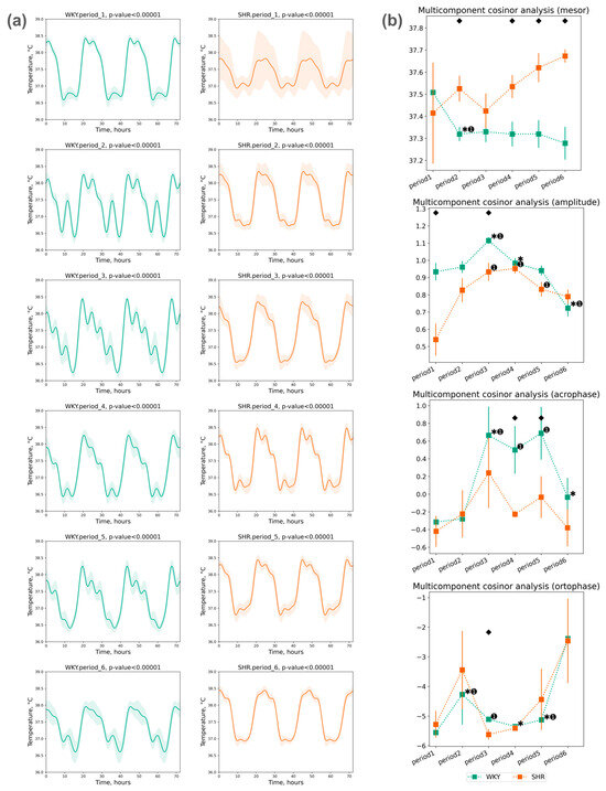 Cosinor analysis of Tcore: (a) Tcore circadian rhythm of 3 days in periods approximated by multicomponent cosinor (component = 5); (b) Measurements of circadian rhythm multicomponent cosinor analysis of Tcore data in 3 days by periods and groups (component = 5): mesor (in °C), amplitude (in °C), acrophase (in radians: phase of ±2π) and ortophase (in radians: phase of ±2π). The evaluation periods under standard lighting conditions were subsequent to days exposed to various experimental lighting conditions: period_1 followed a postoperative recovery week, period_2 followed days following a 20 h light and 4 h darkness regime, period_3 followed a monochromatic light regimen, period_4 followed days affected by light pollution, period_5 followed a regimen of bright light therapy, and period_6 followed continuous illumination (24:0 h). Data are expressed as means ± SEM; ⬥ p < 0.05 WKY vs. SHR in one period, ✱ p < 0.05 vs. previous period, ➊ p < 0.05 vs. first period.