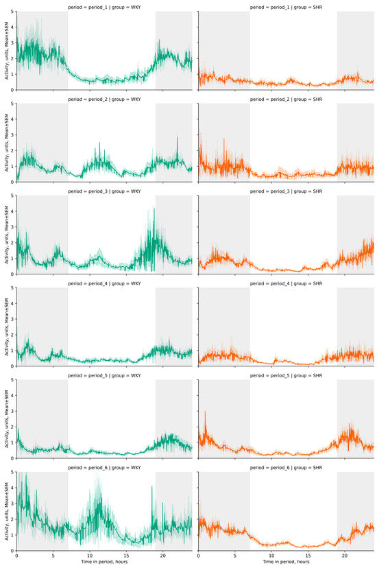 Trend line plots of activity fluctuations across 24 h cycles by periods (period_1–6) and groups (WKY and SHR). Throughout the telemetry data analysis, a standard artificial light–dark cycle was maintained in each period, with dark phases spanning from 19:00 h to 07:00 h (12 h) represented by a gray background, and light phases from 07:00 h to 19:00 h (12 h) denoted by a white background. The evaluation periods under standard lighting conditions were subsequent to days exposed to various experimental lighting conditions: period_1 followed a postoperative recovery week, period_2 followed days following a 20 h light and 4 h darkness regime, period_3 followed a monochromatic light regimen, period_4 followed days affected by light pollution, period_5 followed a regimen of bright light therapy, and period_6 followed continuous illumination (24:0 h). Notably, lower levels of activity were recorded during daylight hours in both groups. In WKY, discernible peaks in activity were observed during the light phases of the second, third, and sixth periods, indicating a sharp increase in activity. Activity data out of IQR was filtered out with the following exponentially weighted calculations (span = 100) for plotting due to high variation and extremely noisy waveforms of original data.