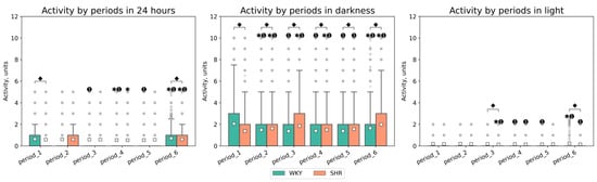Activity values in 24 h, darkness, and light by periods and groups of rats. The evaluation periods under standard lighting conditions were subsequent to days exposed to various experimental lighting conditions: period_1 followed a postoperative recovery week, period_2 followed days following a 20 h light and 4 h darkness regime, period_3 followed a monochromatic light regimen, period_4 followed days affected by light pollution, period_5 followed a regimen of bright light therapy, and period_6 followed continuous illumination (24:0 h). ⬥ p < 0.05 WKY vs. SHR in one period, ✱ p < 0.05 vs. previous period, ➊ p < 0.05 vs. first period; □—Mean value. Activity data out of IQR was filtered out.