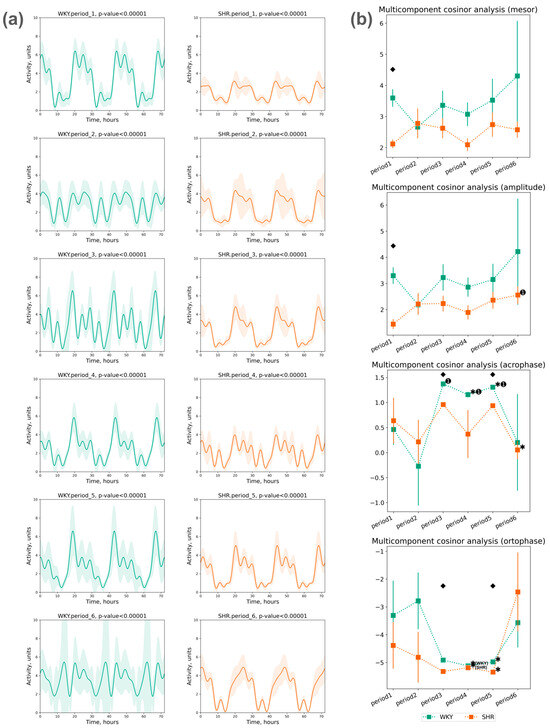 Cosinor analysis of activity: (a) activity circadian rhythm of 3 days in periods approximated by multicomponent cosinor (component = 5); (b) measurements of circadian rhythm multicomponent cosinor analysis of activity data in 3 days by periods (component = 5): mesor (in °C), amplitude (in °C), acrophase (in radians: phase of ±2π), and ortophase (in radians: phase of ±2π). The evaluation periods under standard lighting conditions were subsequent to days exposed to various experimental lighting conditions: period_1 followed a postoperative recovery week, period_2 followed days following a 20 h light and 4 h darkness regime, period_3 followed a monochromatic light regimen, period_4 followed days affected by light pollution, period_5 followed a regimen of bright light therapy, and period_6 followed continuous illumination (24:0 h). Data are expressed as means ± SEM; ⬥ p < 0.05 WKY vs. SHR in one period, ✱ p < 0.05 vs. previous period, ➊ p < 0.05 vs. first period.