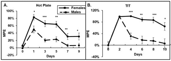 Females have higher responses to acute morphine and delayed developments of tolerance. (A) Hot plate assay. (B) Warm water tail-immersion test. Twenty male and ten female mice received daily i.p. injections of 15 mg/kg morphine for 30 days. The paw withdrawal latency in the HP and tail flick in the TIT tests were determined. Data are expressed as a percentage of maximal possible effect (30 s for HP and 15 s for TIT) and presented as mean ± SEM. (A) *—p = 0.03; **—p = 0.0011 and 0.05; ***—p < 0.001. (B) *—p = 0.03; **—p < 0.01; ***—p < 0.001.
