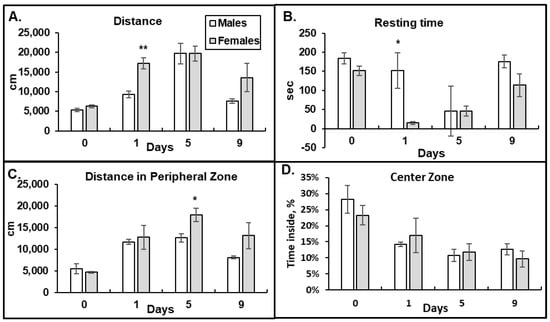 Female mice have higher acute responses to morphine in the Open Field tests than males. High doses of morphine induce anxiety in male and female mice. Distance ran in cm (A), resting time in seconds (B), distance ran in peripheral zone (C), and percent of time spent in the central zone of the chamber (D) that five male and six female mice demonstrated during 15 min interval after 15 mg/kg morphine i.p. injection. Data are expressed as mean ± SEM. (A) **—p = 0.0013. (B) *—p = 0.02. (C) *—p = 0.03.