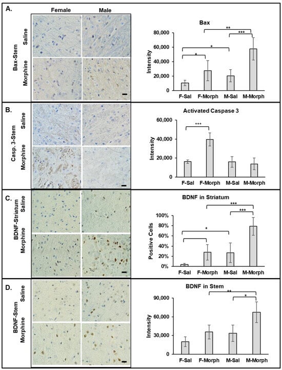Bax (Bcl-2-associated X protein), when activated, induces cell death via the mitochondrial apoptosis pathway. We observed that the number of Bax-positive cells and the intensity of Bax staining increased in both the striatum and stem areas in 30-day morphine-treated males and females compared to that in the corresponding saline-treated animal groups. In the female striatum, morphine almost doubled the number of Bax-positive cells from 10% ± 2% in saline- to 20% ± 7% in morphine-treated animals (mean, SD, n = 6; p = 0.007). In the male striatum, the morphine-induced increase in the number of Bax-positive cells was modest: from 22% ± 2% in saline- compared to 33% ± 9% in morphine-treated animals (mean, SD, n = 6; p = 0.08). Interestingly, the both saline- and morphine-treated male striatum tissues had higher Bax-positive cell numbers and intensity compared to the corresponding female treatment group. Similarly, in the stem, morphine increased Bax expression in both male and female tissues compared to that in the saline-treated animals, with p = 0.02 for saline vs. morphine in the female group and p = 0.0004 in the male group (Figure 3A). Both the saline- and morphine-exposed male stem tissues contained higher levels of Bax compared to that in the corresponding female tissues: p = 0.03 (saline female vs. male) and p = 0.008 (morphine female vs. male) (Figure 3A). These data suggest that neuronal cells in the male mice brain have higher constitutive Bax expression compared to that in female mice. These data also demonstrate that morphine increases the level of pro-apoptotic Bax in neuronal cells in both male and female mouse brains.