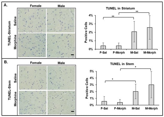 To investigate whether male mouse brains have higher levels of pro-apoptotic cells and whether morphine induces apoptosis in the mouse brain, we performed the TUNEL assay, which detects the level of DNA fragmentation induced by apoptosis. We observed that the male mouse brains had slightly higher numbers of apoptotic cells, even in the saline-treated group: 2% vs. 0.5% in males and females, respectively (Figure 4). Chronic morphine administration did not increase the number of TUNEL-positive cells in male nor female mouse brains (Figure 4).