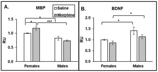 Females have higher MBP levels in plasma, but males have higher BDNF levels. Morphine increases MBP levels in female plasma. ELISA analysis of MBP (A) and BDNF (B) level in plasma of male and female mice treated with saline or morphine for 30 days. MBP and BDNF signals were normalized to the GAPDH signals in the same samples and then to the mean of the female saline value. Data expressed as mean ± SD, n = 6. RU, relative units. *—p < 0.05; ***—p < 0.001.