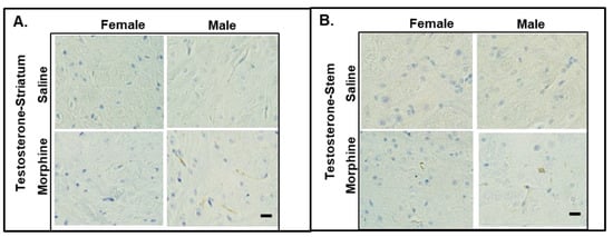 It was reported that testosterone regulates the CREB-BDNF transcriptional pathway, promotes myelination, and protects neuronal cells from oxidative stress and glutamate toxicity in animal models. To monitor the levels of testosterone in the mice treated with 15 mg/kg morphine for 30 days, we performed IHC staining of the brain slices and ELISA assay of the plasma samples. In the IHC analysis, we observed that the male striatum and brain stem showed testosterone staining (Figure 6). We did not detect any testosterone staining in the female brain slices.