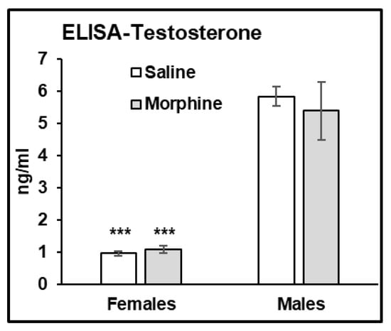 In the ELISA assay, we observed that male plasma contains significantly higher levels of testosterone compared to that in female plasma (male vs. female, p < 0.001 in both water- and morphine-exposed samples (Figure 7)).