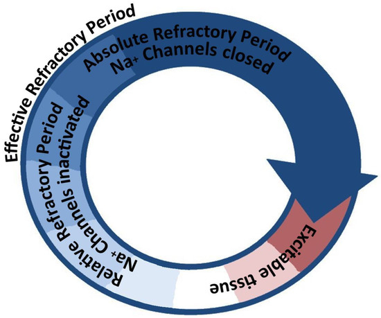 A stylized diagram illustrating the concept of arrhythmogenic re-entry. A circuit (not necessarily circular in shape, illustrated as such for simplicity) that contains a continuous path of conductive tissue, spatially separated in any of the three physical dimensions, that exhibits a heterogenous distribution of conduction velocities and/or repolarization rates can facilitate re-entry. A sufficiently large circuit, enabled either by anatomic (fixed) tissue separation or by functional (slowed conduction velocity) tissue separation, can allow a unified depolarization wavefront (arrowhead) to continuously meet excitable tissue and thus the circuit to activate with a certain cycle frequency. Abbreviations: Na+—sodium.