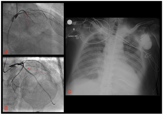 (A) Coronary angiography showing acute occlusion of the proximal left anterior descending artery (LAD); (B) coronary angiography showing established TIMI 3 flow through previously occluded LAD, following percutaneous coronary intervention and drug-eluting stent implantation; (C) antero-posterior chest X-ray showing the implanted ICD. Red arrows show a culprit lesion in the LAD.