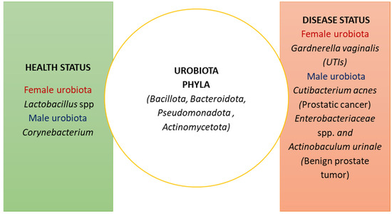 In general terms, microbial composition male urobiota resembles that present in the skin microbiota [51]. Moreover, changes in the male urobiota composition also depend on concurrent disease, since Propionibacterium acnes strains are prevalent in patients with prostatic cancer, whereas Enterobacteriaceae and Actinobacteria dominate in benign prostate tumors [52,53].