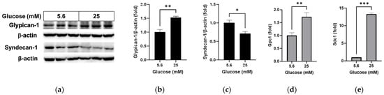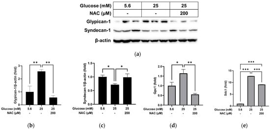 Effect of NAC treatment on the high glucose-induced changes to glypican-1 and syndecan-1 in RRMEC. The relative protein expression levels of glypican-1 and syndecan-1 were normalized to β-actin expression using ImageJ (a–c). The relative mRNA expression levels of glypican-1 (d) and syndecan-1 (e) were normalized to Ppia1 expression. n = 3–6; means ± SE. * p < 0.05, ** p < 0.01, and *** p < 0.001.