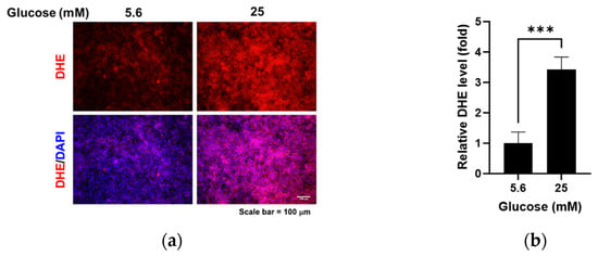 Effect of high glucose on oxidative stress in RRMEC. The representative images of DHE in RRMEC were captured using a fluorescence microscope (a). The relative level of DHE was measured using a microplate reader (b). n = 3–7; means ± SE. *** p < 0.001.