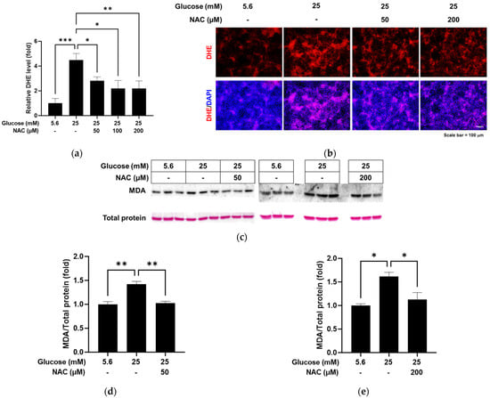 We evaluated the ability of the antioxidant NAC to reduce the oxidative stress caused by high glucose in RRMEC. The relative florescence level of oxidized DHE was found to be significantly decreased by NAC treatment in RRMEC incubated with high glucose (Figure 3a; p < 0.05 at 50 and 100 µM and p < 0.01 at 200 µM), with corresponding images captured using fluorescence microscopy (Figure 3b). MDA is a lipid peroxidation product often used as an oxidative stress marker. Relative MDA-modified protein levels, which were increased by high glucose in RRMEC, were significantly decreased by NAC treatment at a low concentration (50 µM, p < 0.01) and a high concentration (200 µM, p < 0.05) (Figure 3c–e).
