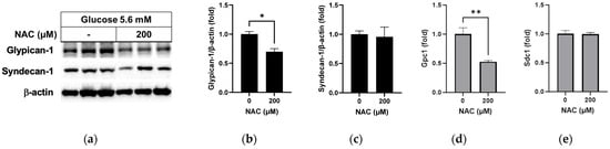 In a test of the effect of NAC under normal glucose conditions, the glypican-1 protein level was found to have decreased significantly following NAC treatment compared to non-treatment (Figure 5a,b; p < 0.05), with a significant decrease in the mRNA level (Figure 5d; p < 0.01). No differences were observed in syndecan-1 protein (Figure 5a,c) or mRNA (Figure 5e) levels following NAC treatment under normal glucose conditions.