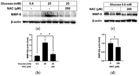 Effect of NAC treatment on MMP-9 in RRMEC maintained in high glucose and normal glucose media. The relative protein expression levels of MMP-9 were normalized to β-actin expression using ImageJ in high glucose media (a,b) and normal glucose media (c,d). n = 3; means ± SE. * p < 0.05.