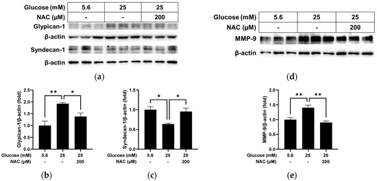 We further evaluated the effect of NAC on the changes caused by high glucose in cultured blood vessels using ophthalmic arteries collected from rats. We found increased levels of glypican-1 (p < 0.01) with reduced levels of syndecan-1 (p < 0.05) after incubation with high glucose in cultured vessels (Figure 7a–c). NAC treatment in cells under high glucose conditions led to reduced levels of glypican-1 (p < 0.05) and increased levels of syndecan-1 (p < 0.05) in cultured blood vessels. MMP-9 levels (Figure 7d,e), which were increased by high glucose compared with normal glucose (p < 0.01), were also reversed by NAC treatment (p < 0.01) in cultured blood vessels.